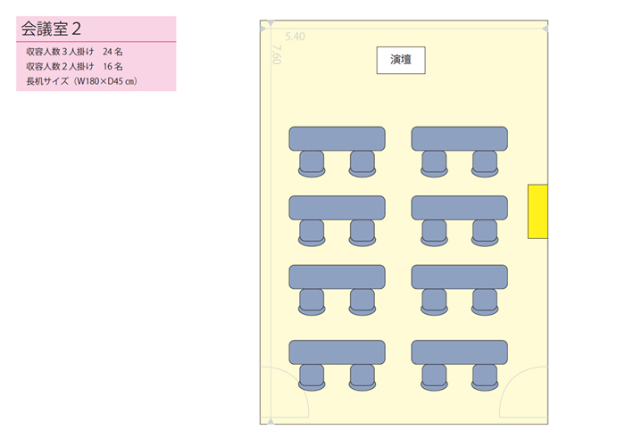 会議室2 会議室レイアウト会議室2レイアウト 概要 面積 43.3㎡/13.1坪 天井高 2.6m 収容人数 16名 設備情報 Wi-Fi 有線LAN 利用時間 9時~21時 付属備品 長机8台、椅子24脚 ※その他、追加オプション、会場設営費は別途。 利用料金はこちら WEBで空室確認・ご予約 ※外部サイトに移動します。 ※予約状況は常に変化しています。空きがあっても操作のタイミングによって予約ができない場合もありますので、あらかじめご了承ください。 その他の会場はこちら 大ホール中ホール小ホール会議室1応接室 お問合せ(TEL&FAX 受付:10時~18時) 貸会場トップページへ戻る